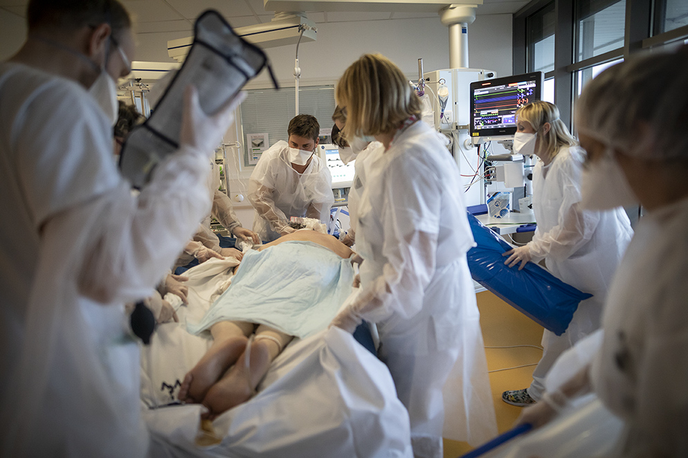 Nancy, le 19 janvier 2022. CHRU de Brabois. Service de réanimation. Unité covid. Les équipes médicales doivent retourner les malades régulièrement pour leur permettre de mieux respirer. Il faut parfois une dizaine de soignants pour s’occuper d’un patient, le soulever, gérer les branchements, surveiller la saturation, le rythme cardiaque. La tâche est routinière, lourde, ingrate pour des personnels épuisés par la charge de travail. Certains patients restent plus d’un mois en réanimation, beaucoup meurent malgré les soins. Face au covid des moyens exceptionnels ont été mobilisés. Une journée en réanimation coûte au minimum, 3000 euros. © Laurence Geai - MYOP / Grande commande photojournalisme