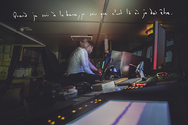 Le pilote à son poste en passerelle du cargo Lady Debora. Avec les pilotes de la Seine, chargés de guider les navires dans les ports. L’auteure de la photographie a écrit sur l’image une parole de marin recueillie lors d’entretiens de recherche menés par le Centre Ressource d'Aide Psychologique en Mer (CRAPEM) de l'hôpital de Saint-Nazaire. « Quand je suis à la barre, je sais que c'est là où je dois être.» © Lorraine Turci / Grande commande photojournalisme