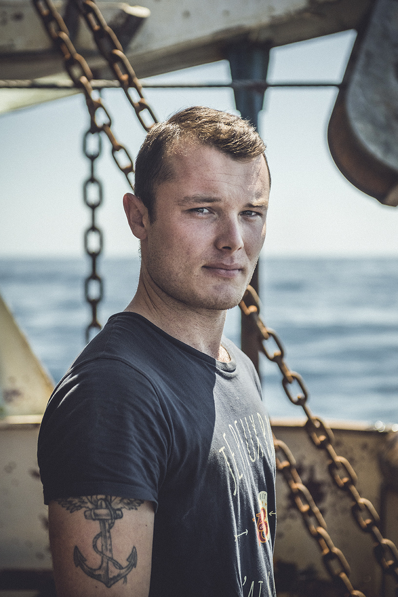Portrait de Matthis, second mécanicien. Quinze jours de pêche hauturière sur le chalutier le Blue wave, à 200km au large des côtes bretonnes. © Lorraine Turci / Grande commande photojournalisme