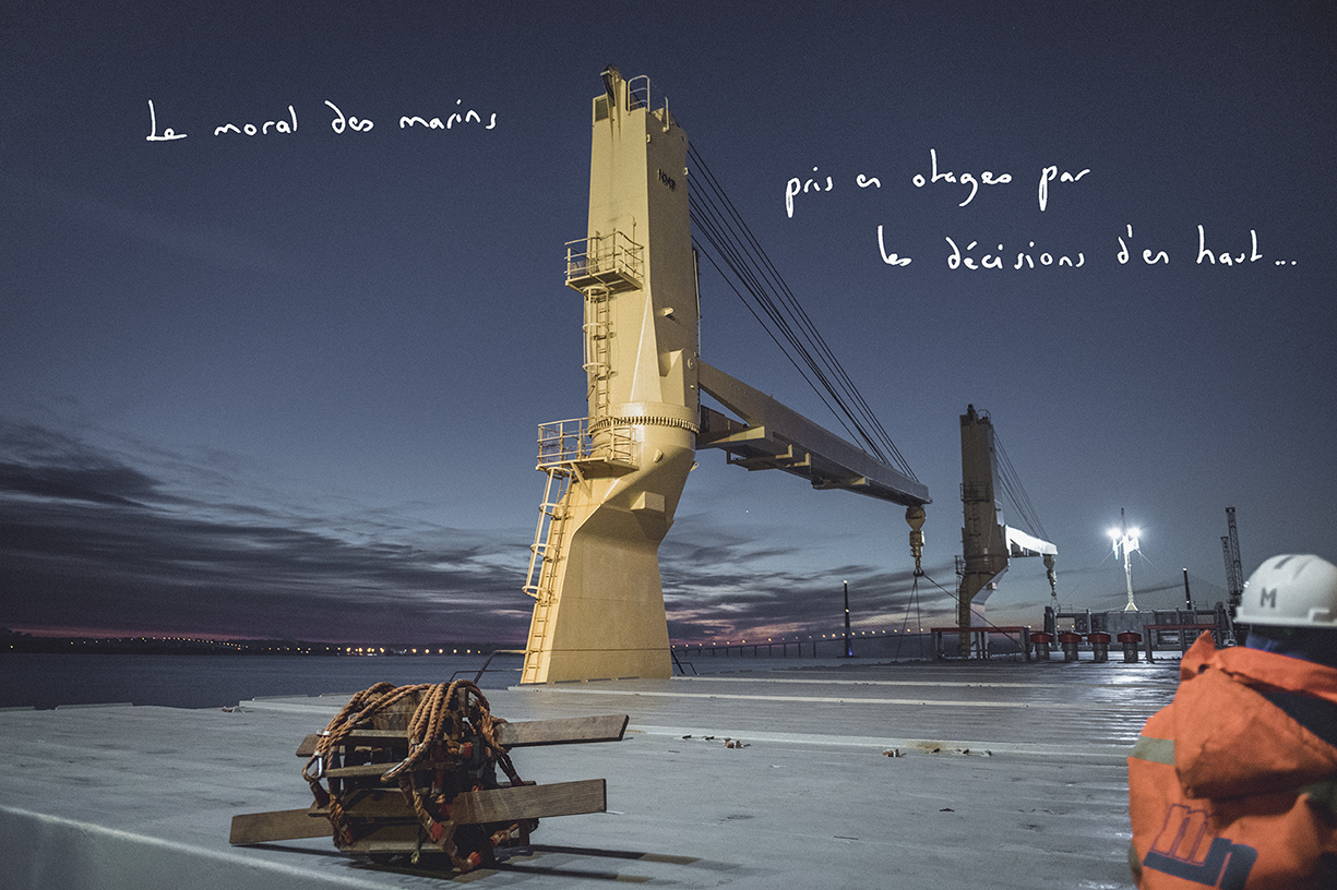 L’auteure de la photographie a écrit sur l’image une parole de marin recueillie lors d’un entretien. « Le moral des marins pris en charge par les décisions d’en haut…» © Lorraine Turci / Grande commande photojournalisme