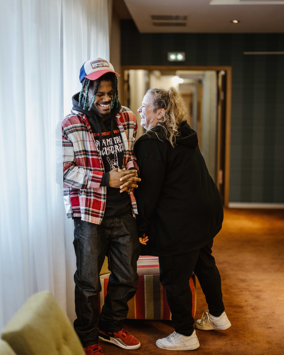 Céline Brunelle, metteuse en scène et directrice de la compagnie Le Passe-Muraille (droite) et José Manzambi, comédien et musicien (à gauche), à Amiens (Somme), lundi 26 décembre 2022. Pendant deux ans, Céline Brunelle directrice de la compagnie amiénoise Le Passe-Muraille, a accompagné José, apprenti comédien et musicien, dans son parcours administratif pour être régularisé. En ultime recours, elle a menacé, en décembre 2022, la préfecture de la Somme d’une grève de la faim. Céline et José se sont rencontrés en juin 2019. Le jeune homme, né en République démocratique du Congo, a grandi en Angola où il était considéré comme enfant sorcier. Pourchassé et violenté, il a connu la rue en Angola avant d’arriver en France en 2017 à l’âge de 16 ans. Entré sur le territoire avec de faux papiers de majeurs, il a été reconnu mineur et placé sous la protection de l’aide social à l’enfance et a entamé des études en lycée. C’est à cette époque que Céline l’a auditionné pour son spectacle « Du silence à l’explosion » qui s’est produit au festival Off d’Avignon. Conquise par son talent, elle a décidé de le faire travailler. De là est née une amitié forte basée sur une admiration professionnelle réciproque. Suite aux menaces de grève de la faim de Céline, la préfecture a finalement accepté de régulariser le jeune homme à la fin de l’année 2022. En janvier 2023, José Manzambi a pu signer un contrat expérimental de 12 mois avec Céline où il est employé en tant qu’artiste dramatique et technicien de son. © Nathalie Bardou/Hans Lucas / Grande commande photojournalisme
