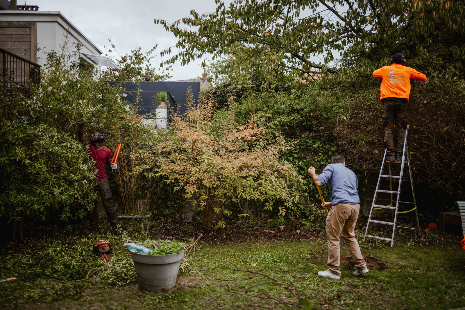 Cédric Schneider, patron de la société Confort Services, une société d’entretien de paysage et d’aide à la personne (au centre, de dos) et son apprenti Demba Camara (gauche), travaillent sur un chantier, près de Nantes (Loire Atlantique), lundi 03 octobre 2022.