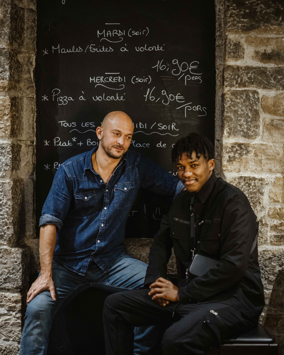 Romain Donier co-gérant du restaurant l’Antr’act (gauche) et Mamadou Saliou Diallo, son second de cuisine (droite), dans le restaurant l’Antr’act, à Besançon (Doubs), jeudi 15 décembre 2022.