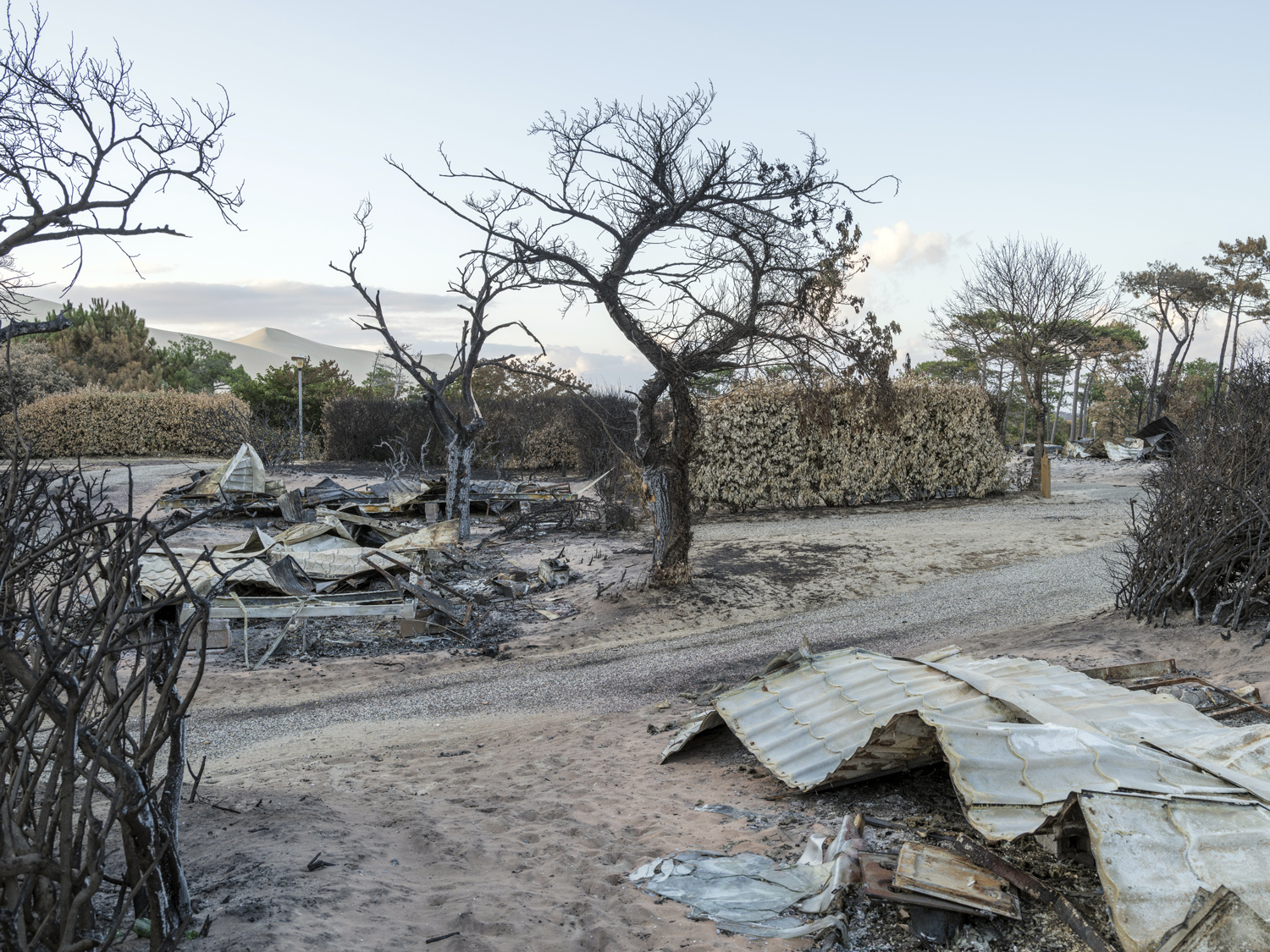 Après plus d'un mois dans les flammes, l'incendie de la Teste-de-Buch a ravagé pas moins de 7 000 hectares de forêt en Gironde. Ici le célèbre camping Les Flots Bleus au pied de la Dune du Pilat et ayant servi de décor au film Camping. © William Daniels / Grande Commande Photojournalisme