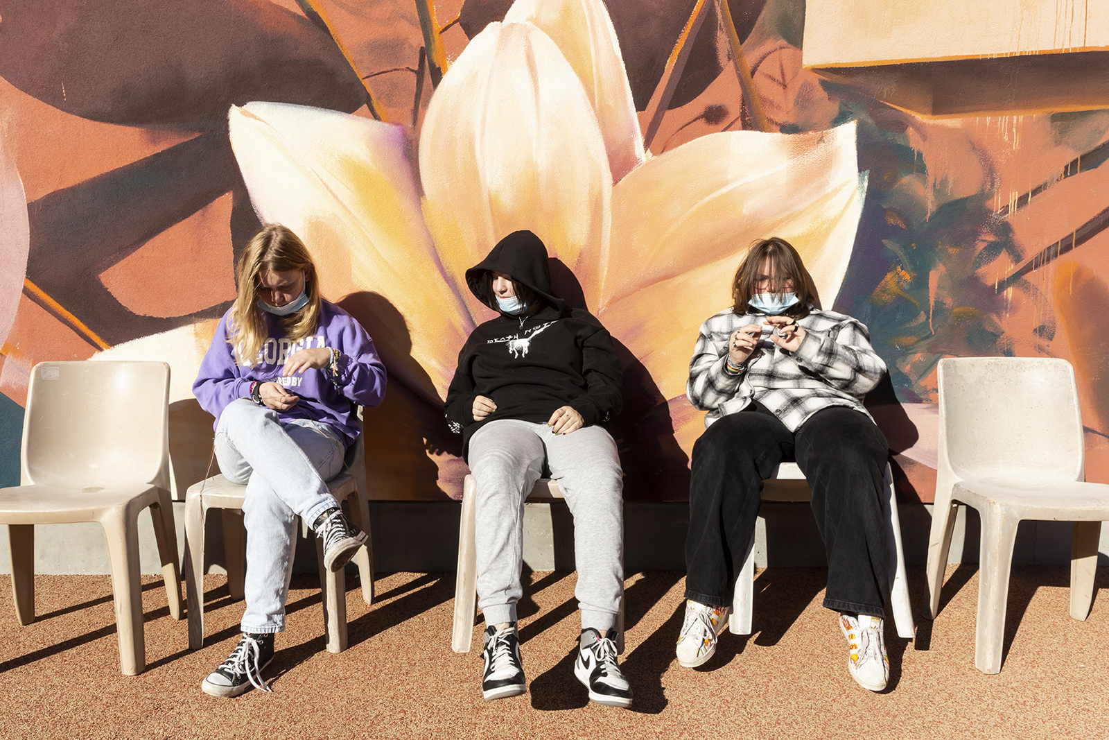 Kamrynn (14 ans), Lilou (12 ans) et Lya (13 ans) dans la cour d'Uspilon. Upsilon, unité psychiatrique d'hospitalisation pour les enfants et adolescents de 11 à 17 ans). Le 12 Novembre 2022. © Claire Delfino / Grande Commande Photojournalisme