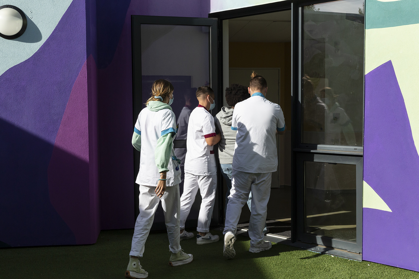 Une patiente se fait reconduire dans sa chambre par une équipe de soignants, dans la cour de l'USA. Unité de soins aigus d'Uspilon (unité psychiatrique d'hospitalisation pour les enfants et adolescents de 11 à 17 ans). Le 24 Octobre 2022. © Claire Delfino / Grande Commande Photojournalisme