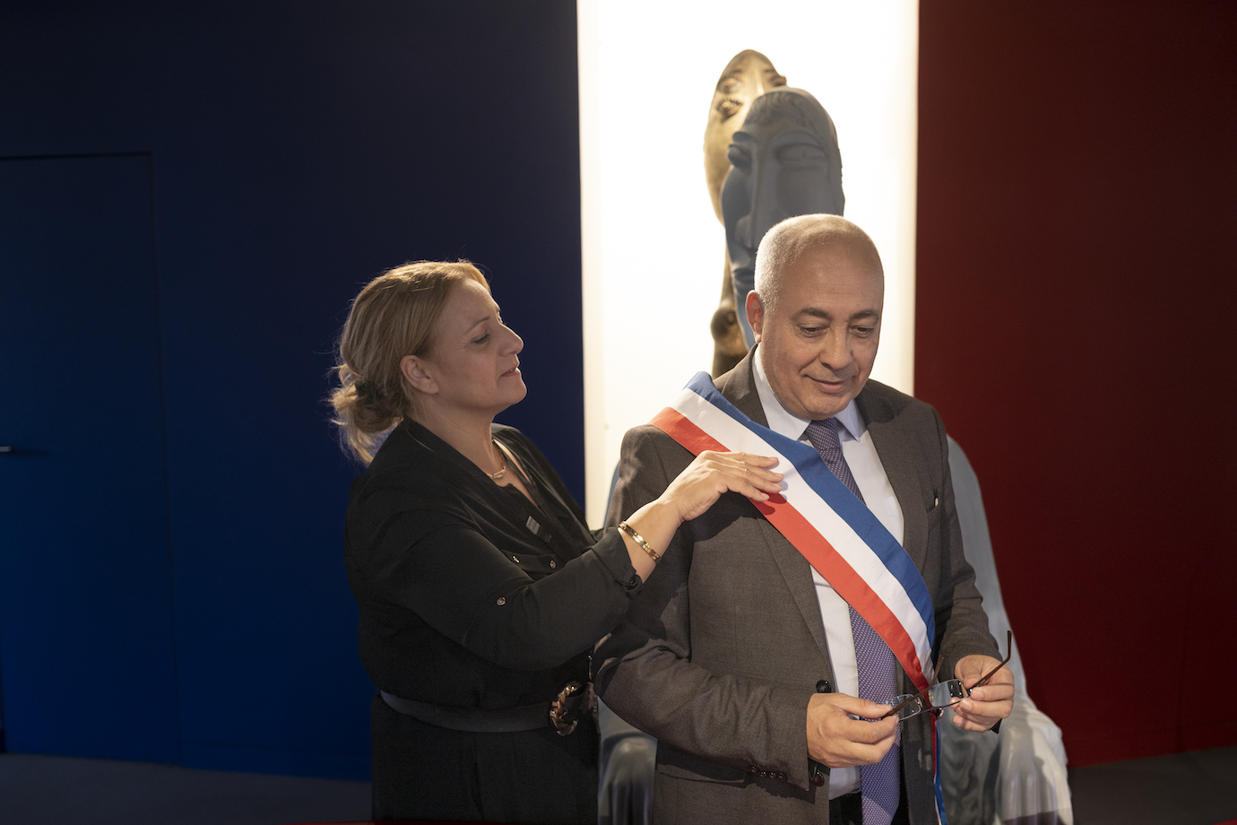 Abdel Sadi, 60 ans, est maire de Bobigny, préfecture de la Seine-Saint-Denis, depuis 2020. Une employée de la mairie réajuste ici son écharpe, alors qu’il s’apprête à célébrer un mariage. Les parents d’Abdel Sadi, algériens, sont arrivés en région parisienne à la fin des années 1950. À la différence de ses huit frères et sœurs qui ont tous vu le jour en Algérie, lui est né à Paris. Il a commencé à travailler à 17 ans comme animateur dans des centres de vacances, d’abord à Aubervilliers, puis à Bobigny qu’il ne quittera plus. Rapidement, il se retrouve à la tête du syndicat des animateurs de la ville qui tentent de défendre leur statut. Il est embauché au service jeunesse de la municipalité. Ce sympathisant communiste – mais jamais encarté –, au contact des jeunes Balbyniens, entre en politique ; il est élu municipal, d’abord comme adjoint à la Jeunesse. Après un premier échec, il est élu vice-président du Conseil départemental. Aux municipales de 2020, il est poussé par le Parti communiste pour récupérer la ville, qui lui a échappé pour la première fois depuis un siècle au profit d’une municipalité de centre droit (UDI) lors des élections précédentes, en 2014. © Frédéric Migeon - Hans Lucas / Grande commande photojournalisme