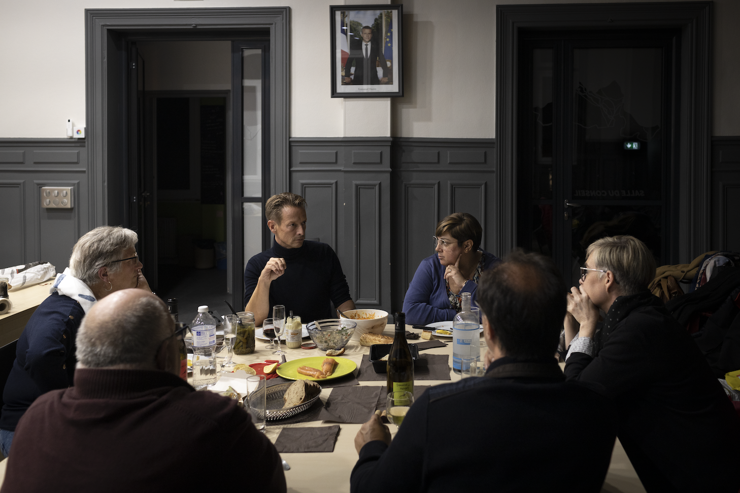 Agacés de ne pouvoir communiquer aisément avec le maire depuis son retour de vacances en Albanie, ses adjoints ont organisé un dîner avec lui dans la salle de réception de la mairie. Les élus reprochent notamment à Guillaume Coutey de ne pas être assez présent ; ils ont même listé sur une feuille de papier leurs griefs et les points qu’ils souhaitent aborder avec lui. En guise de réponse, il énumère avec emphase tout ce qu’il a accompli depuis une semaine, prenant à témoin le photographe présent. Et enchaîne en demandant à chacun d’entre eux de lui présenter très rapidement un plan de sobriété pour les mois à venir. Sans aucun doute, il a souvent (toujours ?) le dernier mot. © Frédéric Migeon - Hans Lucas / Grande commande photojournalisme