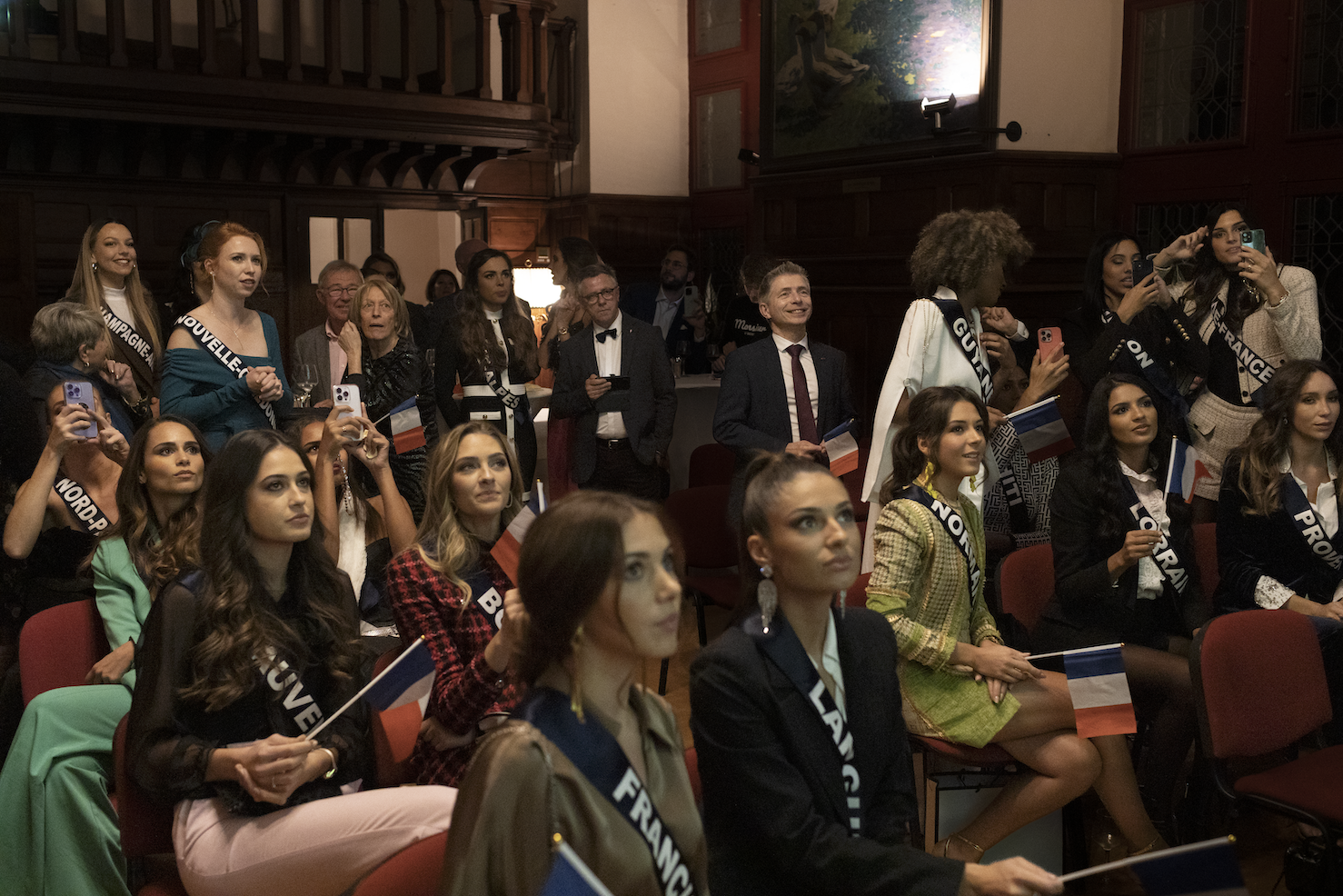 10 décembre 2022. Au château Raoul, à Châteauroux, Gil Avérous regarde le match de quarts de finale de la Coupe du monde, France-Angleterre, en compagnie de quelques officiels triés sur le volet et des 30 candidates à l’élection de Miss France. La ville de Châteauroux accueille le concours pour la seconde fois. © Frédéric Migeon - Hans Lucas / Grande commande photojournalisme