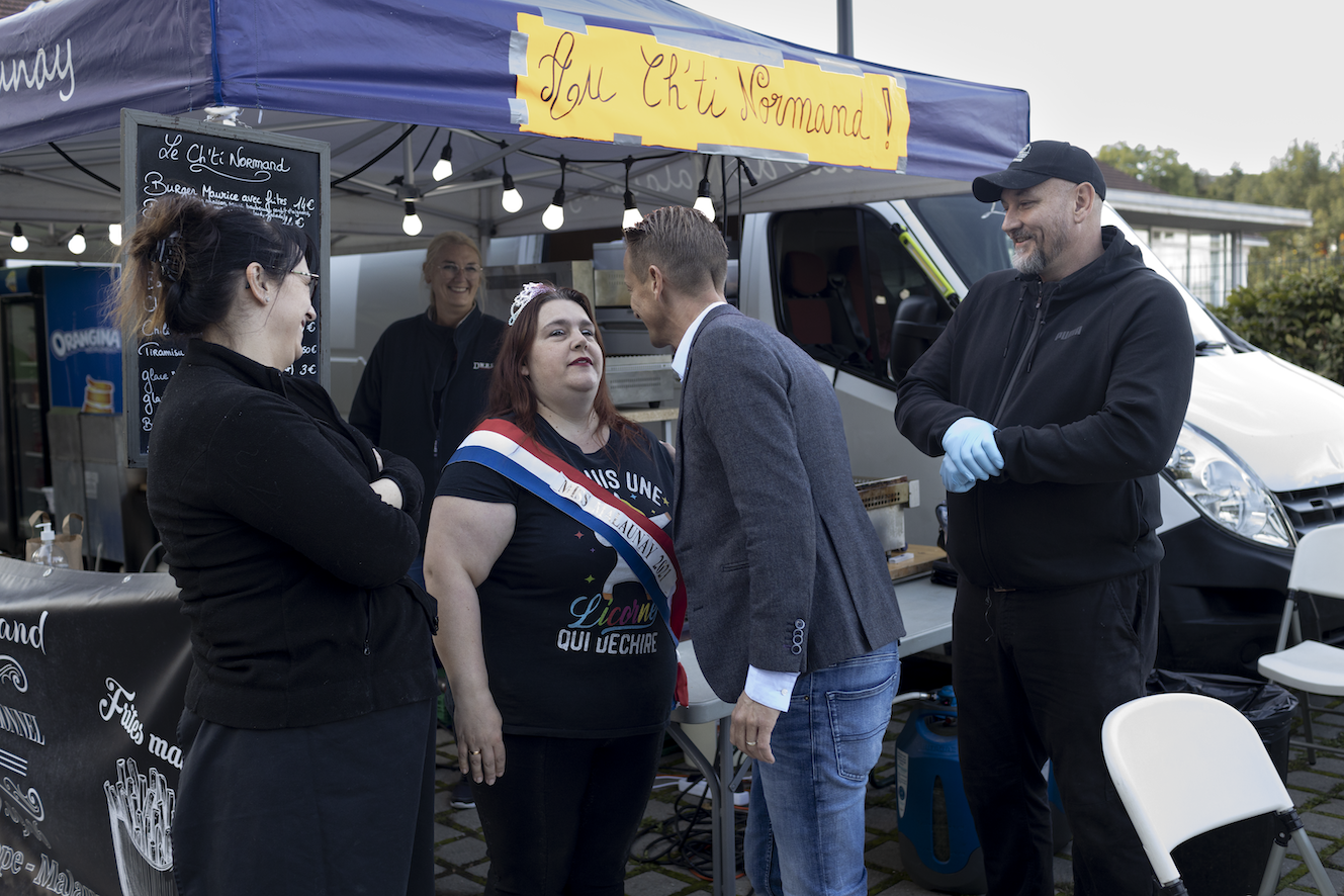 Lors de la fête de la Saint-Maurice, le 17 septembre 2022, Guillaume Coutey salue Élodie Bourdon, l’une des associées du restaurant Au Ch’ti normand. La jeune femme a tanné le maire à plusieurs reprises pour qu’il organise une élection de Miss Malaunay. Peu enclin à mettre en place un tel évènement, il a fini par la déclarer Miss Malaunay sans autre forme de procès. Depuis, elle arbore son écharpe lors des fêtes de la ville. © Frédéric Migeon - Hans Lucas / Grande commande photojournalisme