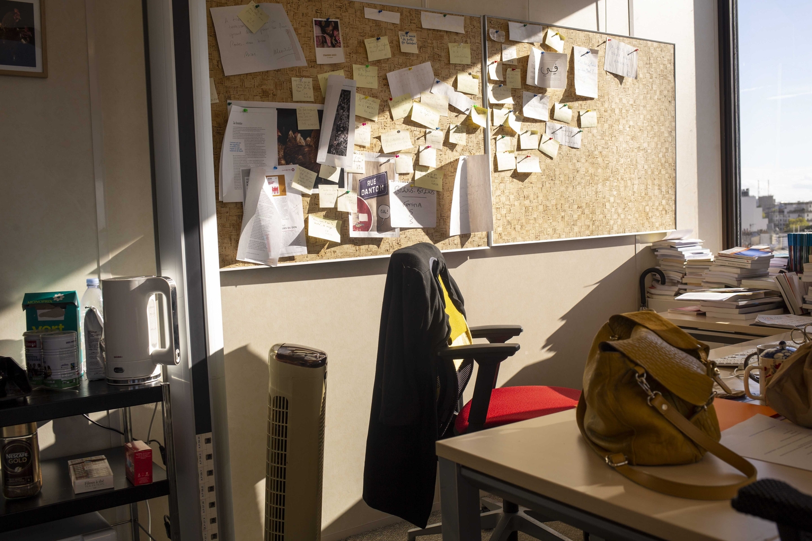 Un poste de travail attitré et personnalisé, un mur de pense-bêtes, notes post-it. Conséquence du développement du télétravail depuis de la crise sanitaire, les bureaux des entreprises sont plus nombreux à rester vides ou peu occupés. ©Marta Nascimento / Grande Commande Photojournalisme