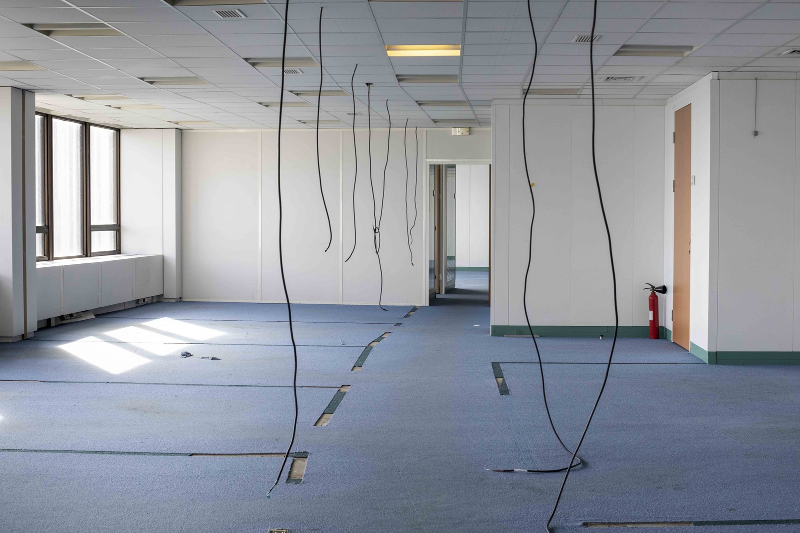 Un étage d'une tour vidé de ses bureaux, traces sur la moquette, câbles électriques qui tombent du plafond. ©Marta Nascimento / Grande Commande Photojournalisme