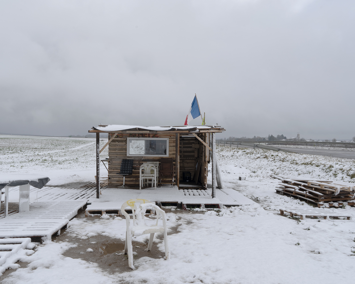 Les gilets jaunes du rond-point d'Aumetz n'ont pas quitté leur position depuis bientôt quatre ans. Ils reflètent la complexité d'un territoire où ceux qui restent sur le bord de la route regardent passer des frontaliers s'accomplissant économiquement peu enclins à la lutte collective. © Samuel Bollendorff
