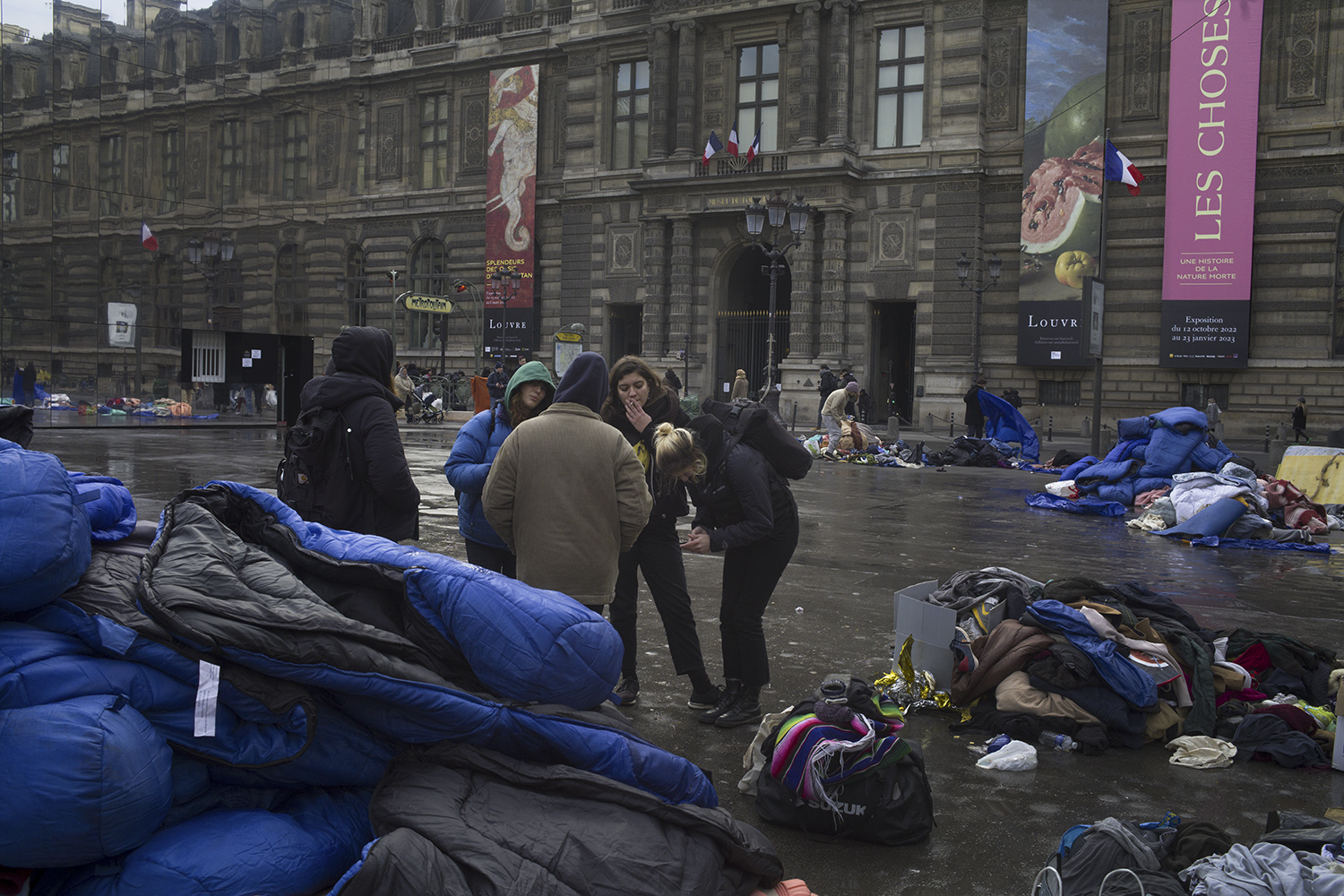 Décembre 2022. Clara, Anna, Zelda, les jeunes militantes de l’association Utopia 56 après l’expulsion par la police du campement de jeunes migrants sur la Place du Palais Royal, devant le Conseil d’Etat, pour réclamer de meilleures conditions d’accueil.