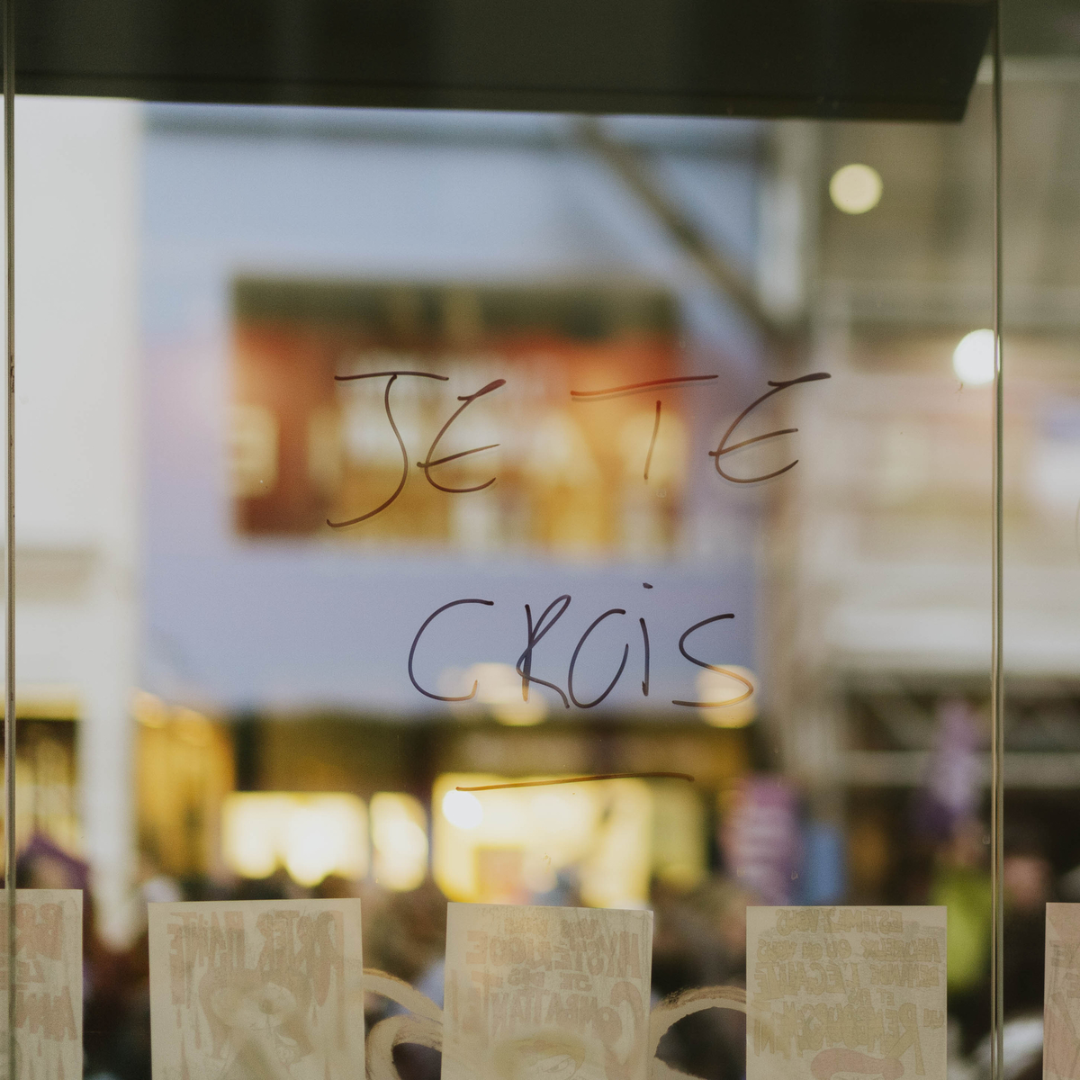 Écrit au feutre sur la vitre d’un arrêt de bus non loin du parcours de la marche contre les violences sexistes et sexuelles (VSS) du 19 novembre 2022 à Paris. Cinq ans après l’émergence du mouvement #MeToo , près de 90 associations, syndicats ou partis de gauche appellent à un « raz-de-marée dans la rue pour crier notre colère » face aux violences sexistes et sexuelles, qui « trouvent racine dans le patriarcat ». « Je te crois » pour « il faut croire les victimes d’agressions sexistes et sexuelles lorsqu’elles les dénoncent », ce qui est encore trop rare. En 2020, les appels entrants au 3919, le numéro d’aide aux femmes victimes de violences, ont augmenté de 70% tandis que seulement 0,6% des viols ou tentatives de viol ont donné lieu à une condamnation la même année. © Gaelle Matata / Grande Commande Photojournalisme