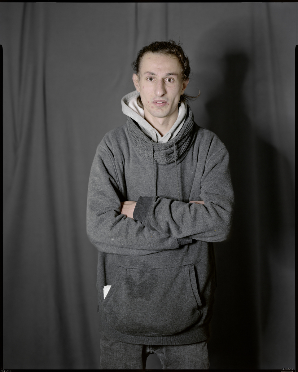 Portrait de Sasha usager du Crack photographié en studio avec une chambre 8*10 inches deardorff sur film Kodak portra 160. © Yann Morvan / Grande commande photojournalisme