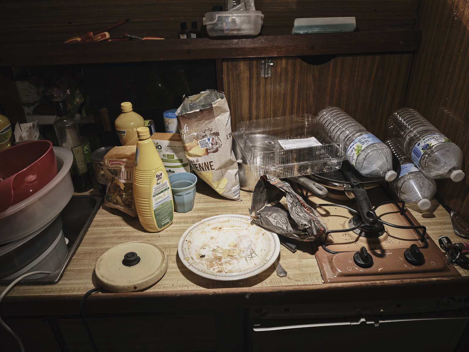 Claude 65 ans vit sur son bateau depuis 14 ans à Montech dans le Tarn-et-Garonne. Son bateau est posé au fond du canal, sans moteur, sans porte. ll vit dans 5 m² entre sa cuisine et son lit. Il préfère sa liberté que vivre dans un appartement comme tout le monde. Depuis deux ans financièrement ça va mieux car il touche enfin sa retraite. Il a pu s’acheter une Harley-Davidson mais pour rien au monde il changerait sa façon de vivre. Il mange pour se nourrir. Il ne prépare rien et réchauffe, cuit à la limite un œuf, il ne mange pas de poisson, éventuellement des sardines, pas de viande que de la charcuterie, jamais de légumes. Sa petite faiblesse ce sont les bonbons, le chocolat, et « les têtes de nègres » comme il les appelait à l’époque. Son rituel. Le repas est devant un écran, l'ordinateur ou le téléphone. Pour ce qui est du budget, il ne compte pas, mais ne dépense pas grand-chose, une vingtaine d’euros par semaine. La crise sanitaire n’a rien changé pour lui, ni sur sa façon de vivre, ni sur sa façon de manger. De toute façon il n’allait jamais au restaurant. Il ne reçoit jamais personne non plus. © Laurent Moynat / Grande commande photojournalisme