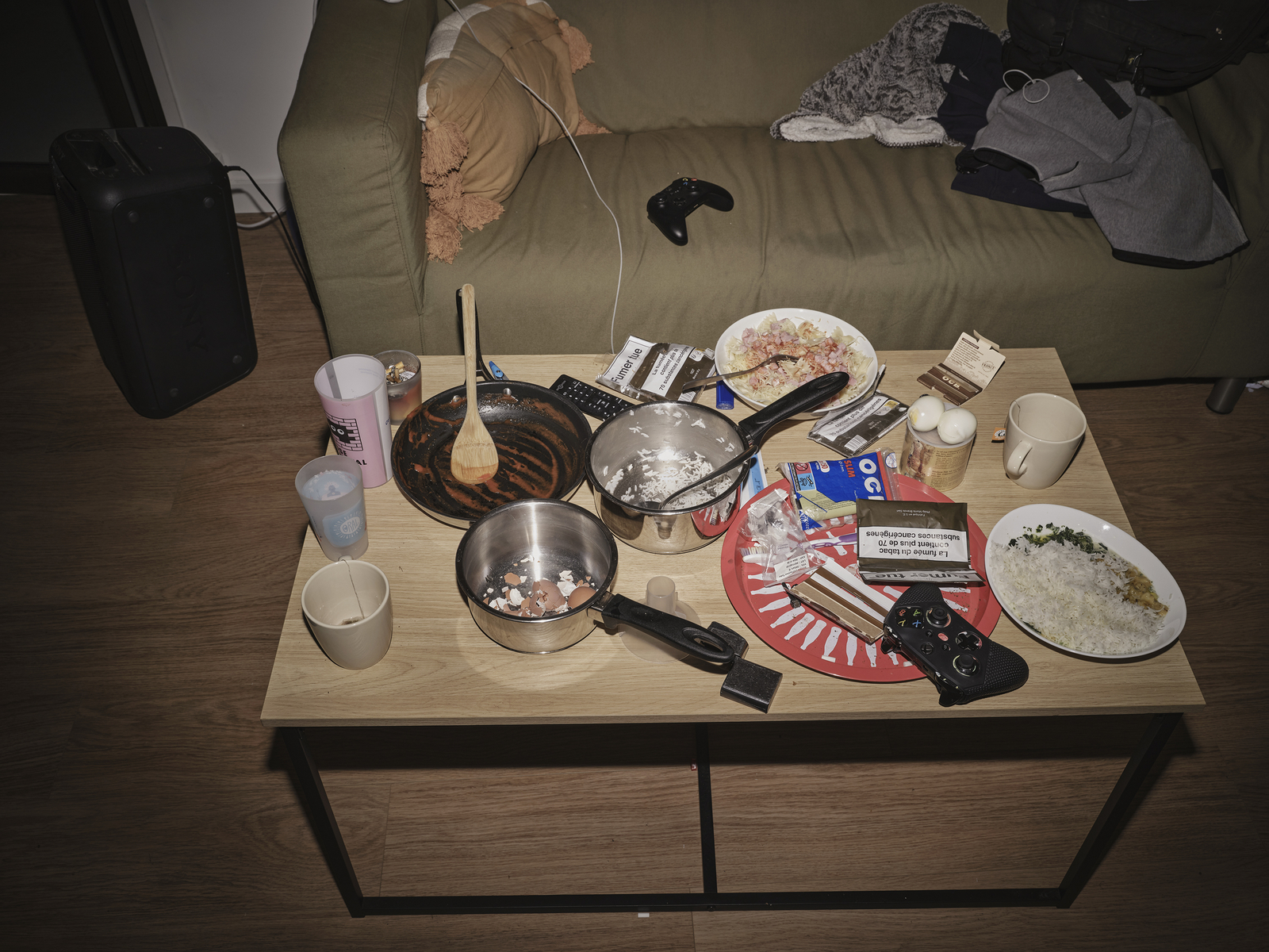 Joseph 22 ans, Andrei 19 ans, Tristan et Nico 20 ans vvent au Mirail, cité de la Reynerie, en banlieue toulousaine. Joseph est étudiant en philo à l’université Toulouse Mirail, Andrei a arrêté la fac cette année pour se consacrer à la musique, Tristan était aux Beaux-Arts mais travaille maintenant dans une association culturelle. Nico est en deuxième année de design graphique. Cette colocation est née d’une rencontre aux Beaux-Arts. L’organisation est simple, c’est chacun pour soi. Ils ont chacun un étage dans le frigo, courses individuelles. Andrei et Joseph prennent soin chacun de préparer de vrais repas. Tandis que Tristan est dans une période de performance sportive avec pas mal de compléments alimentaires. Nico mange ce qui passe et se fait souvent livrer avec quelques arnaques à Uber Eat. Tous mangent très peu de viande par souci économique, œufs et fromages compensent. Pâtes et riz sont les basiques. Il n’y a aucun rituel autour du repas à part de temps en temps devant la console ou un «truc» sur un écran. © Laurent Moynat / Grande commande photojournalisme