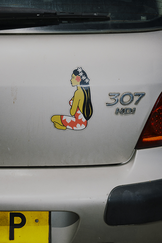 Autocollant sur une voiture à Tahiti. Tahiti, Polynésie française, septembre 2022. © Richard Pak / Grande commande photojournalisme