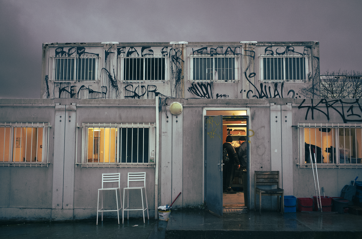 Le lieu de distribution des repas chauds de l'association La Chorba, situé dans une salle construite à partir de conteneurs. Chaque soir, l'équipe de bénévoles et d'employés prépare et distribue près de 700 repas chauds, ce qui fait du site de la Porte de la Villette le plus gros centre de distribution de repas assis de France. © Lys Arango / Grande commande photojournalisme