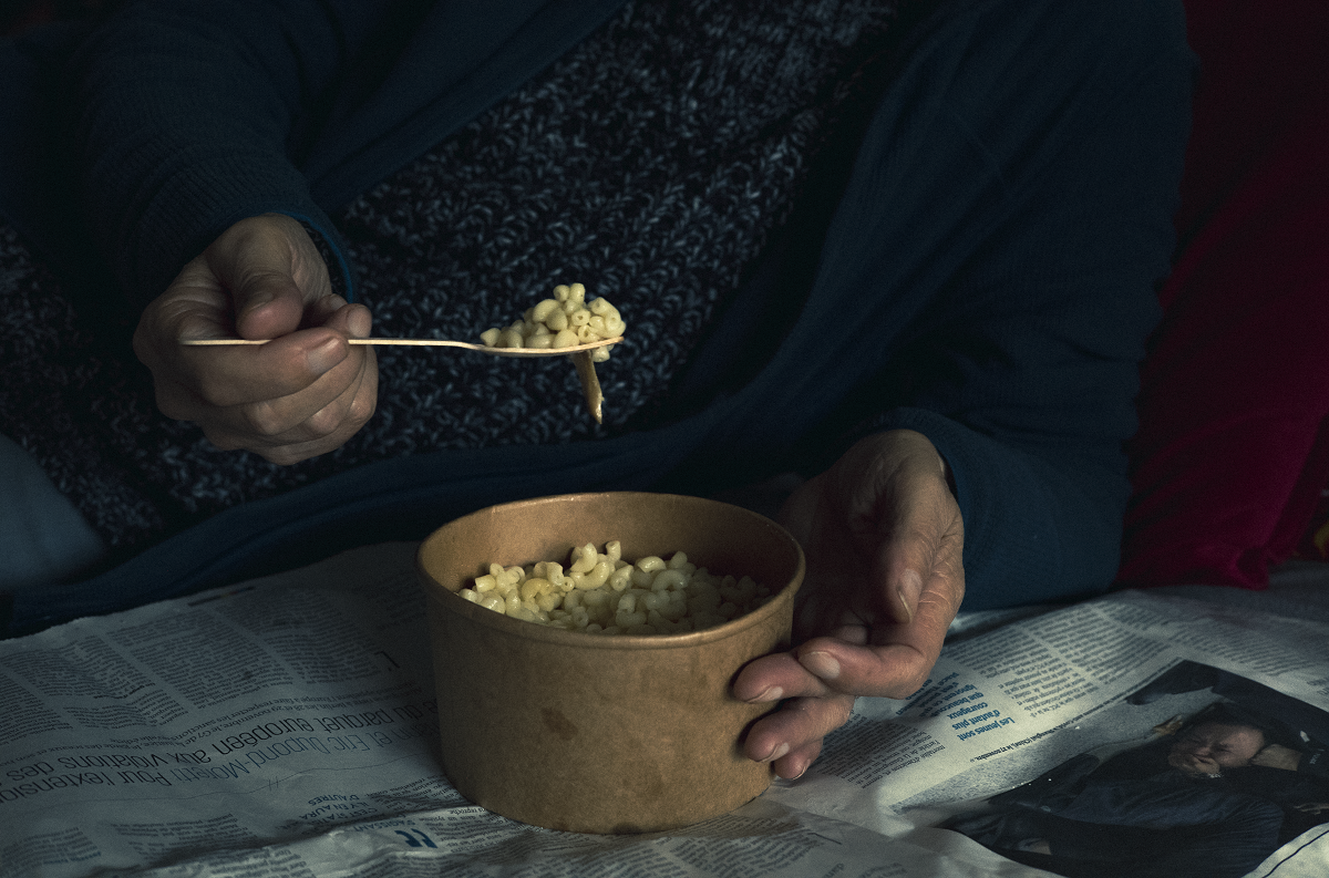 Détail des mains d'un homme retraité qui mange une assiette de coquillettes, distribuée par les Restos du Coeur en Ile-de France. Pour de nombreuses personnes âgées en situation de précarité, cette aide alimentaire est essentielle pour subvenir à leurs besoins quotidiens. © Lys Arango / Grande commande photojournalisme