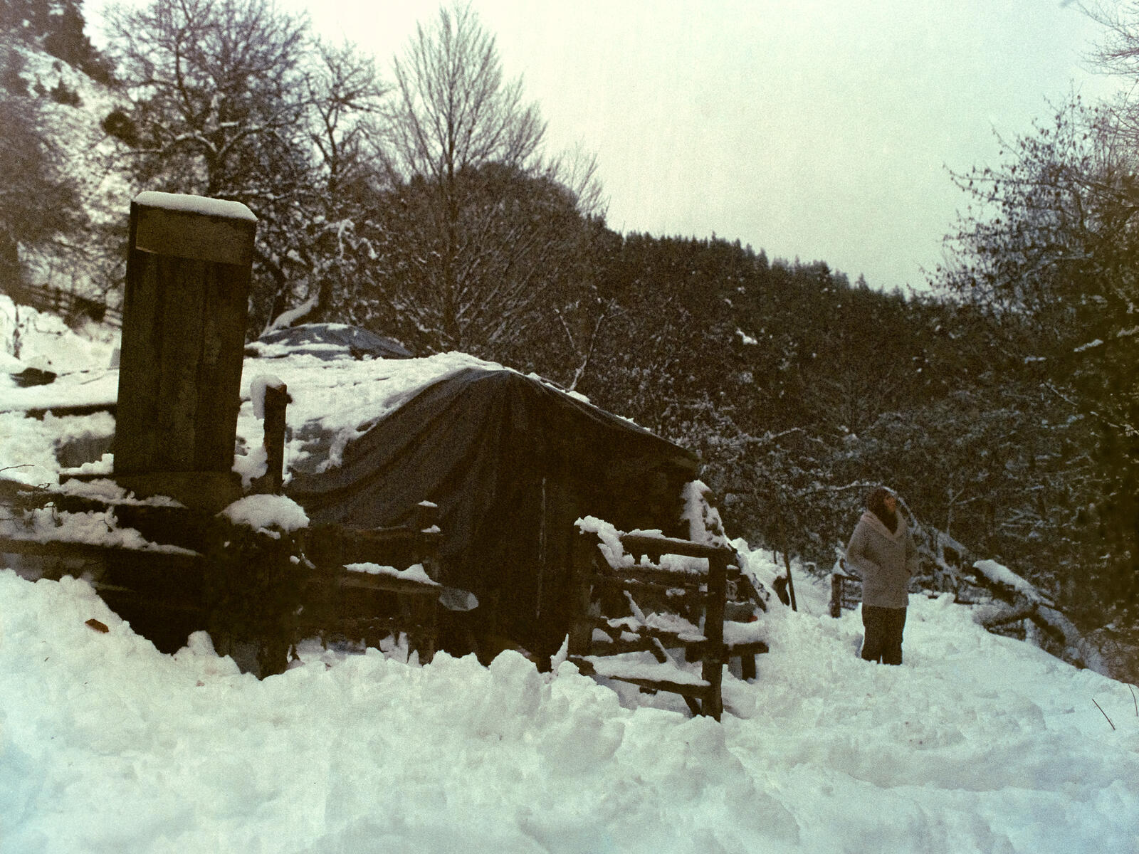 Julie regarde le ciel, à l'entrée de sa cabane, un monticule semi-enterré qu'elle ne peut ni chauffer, ni éclairer. En plus d’un inconfort évident, lorsqu'il neige ou pleut à torrent, elle craint que la structure du bâtiment ne s’effondre et l'engloutisse. © Arthur Mercier / Grande commande photojournalisme
