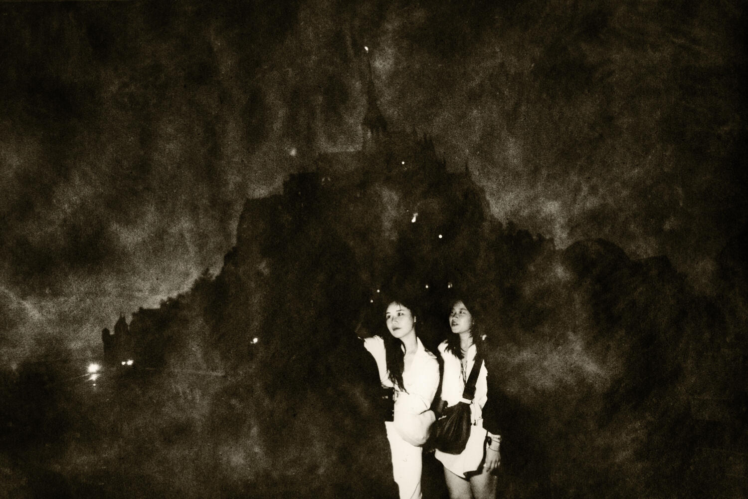 Touristes qui s‘éclairent pour une séance de selfie devant le Mont-Saint-Michel. © Romain Laurendeau / Grande commande photojournalisme