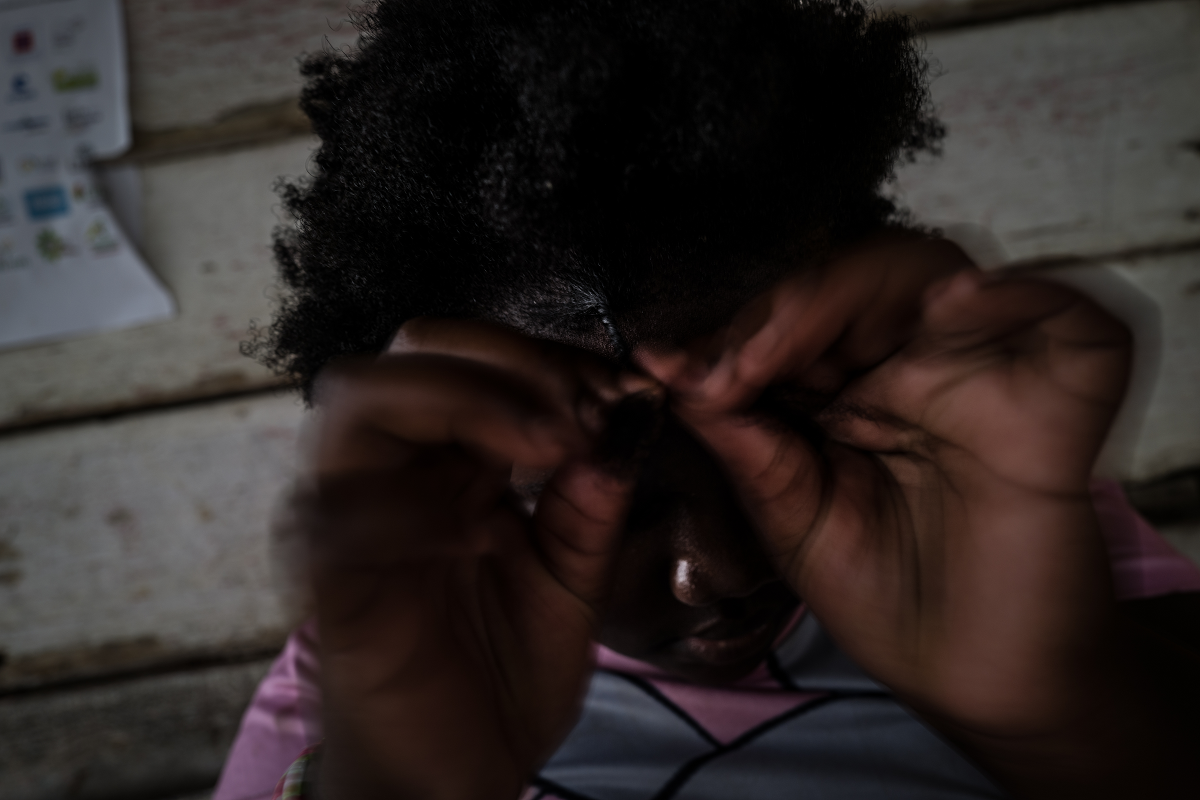 Sayenne, âgée d’une dizaine d’années, se tresse les cheveux en attendant que la pluie cesse. Elle m’apprend quelques mots de taki taki et traduit ce que sa grand mère cherche à me dire. © Emilienne Malfatto / Grande commande photojournalisme