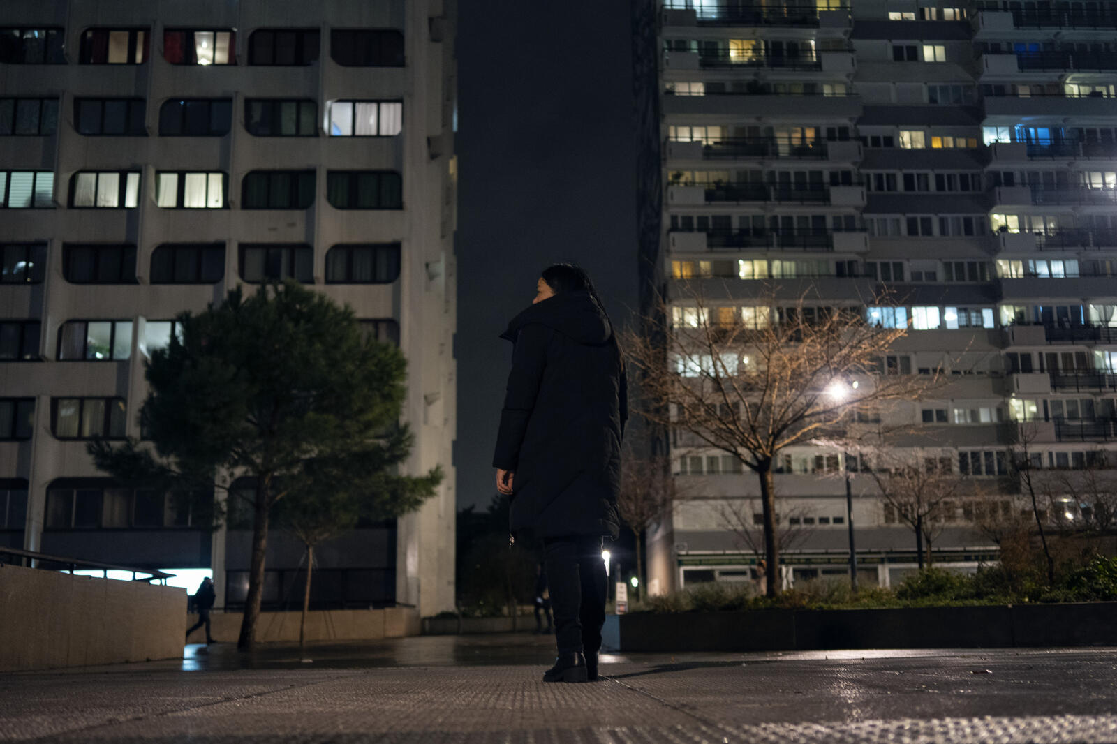 Mme J. pose de dos, à la Porte de Choisy. Elle part souvent en province travailler, avec une ou deux copines elles louent des studios dans des villes où elles restent entre trois et six semaines puis reviennent à Paris. “Comme ça on travaille beaucoup un temps, puis on profite de la vie. Parfois on part juste en voyage découvrir la France. C’est un beau pays et on est libre ici, ce n’est pas comme en Chine.” © Boris Svartzman / Grande commande photojournalisme