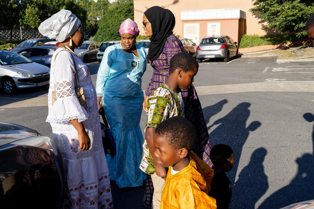 FRANCE. Evry-Courcouronnes, salle polyvalente Bexley, le 16 juillet 2022. Fête de femmes maliennes pour l’aïd. De gauche à droite : Maimouna, Adama et Fanta Keita, filles d’Astan. © Patrick Zachmann – Magnum Photos / Grande commande photojournalisme