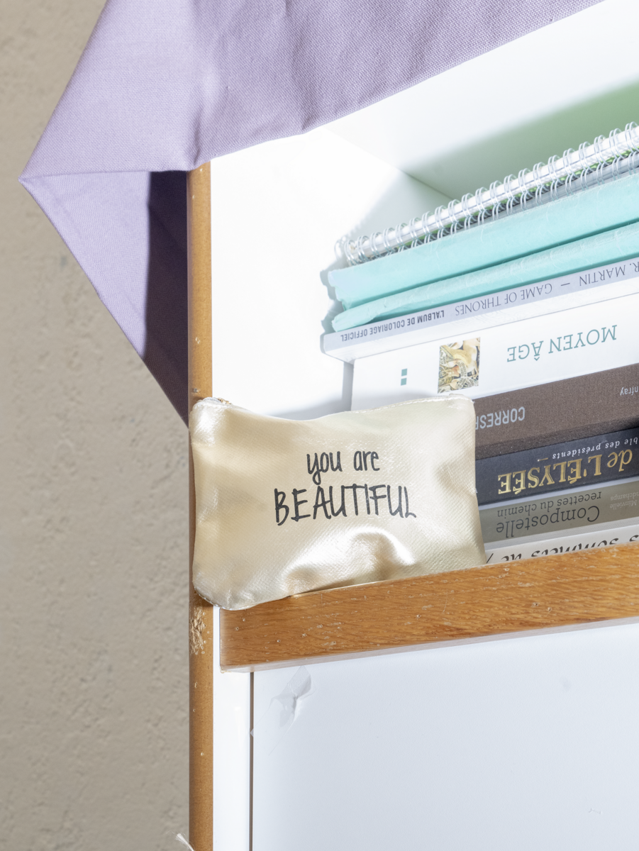 Etagère de rangement de la cellule d’une personne détenue dans le quartier ouvert du centre de détention pour femmes de Rennes. Certaines personnes détenues mettent des années à cantiner et accumuler des objets de première nécessité à l’intérieur de la prison. © Mélanie Wenger / Grande commande photojournalisme